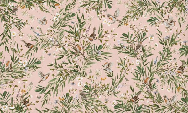 Zachte tonalità rosa creano lo sfondo per pettirossi che cantano, margherite, farfalle e fresche foglie verdi. Questo design leggero emana tranquillità, primavera e romanticismo con un fascino giocoso e naturale.