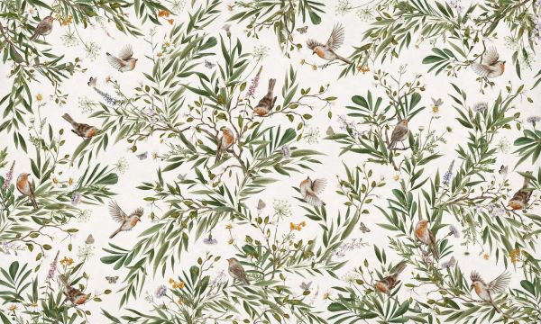 Questo fresco e vivace design porta la sensazione di un prato fiorito estivo direttamente in casa. Su uno sfondo chiaro, quasi color crema, si possono vedere pettirossi che si muovono liberamente tra una ricchezza di foglie verdi, fiori morbidi in bianco, lilla e arancione e farfalle giocose. Le foglie sono rappresentate in modo realistico in diverse tonalità di verde, che vanno dall'oliva al verde brillante, conferendo all'insieme un carattere botanico e vivace. La combinazione di tonalità verdi naturali con accenti caldi dei pettirossi e dei fiori crea un insieme perfettamente bilanciato che trasmette energia e tranquillità. Questo stile si adatta perfettamente a un interno botanico o eclettico, dove materiali naturali, pareti chiare e piante predominano. Anche in un interno moderno di ispirazione scandinava, questo design offre una pausa fresca e giocosa senza creare confusione visiva. Il motivo è ricco ma arioso: gli elementi sono distribuiti in modo giocoso e hanno una struttura aperta, rendendo il design mai troppo affollato nonostante i dettagli. Gli uccelli creano una sensazione di movimento, come se la natura fosse in piena fioritura e tu fossi in mezzo a un campo soleggiato. Ideale per spazi che richiedono freschezza e luce: un soggiorno, una cucina, una sala giochi o persino un ingresso. Abbinare questo design a materiali naturali come legno, lino e ceramica. Gli accessori in colori chiari - come il verde salvia, la sabbia, il crema o i toni pastello - rafforzano la sensazione di freschezza e apertura, creando un'atmosfera invitante e allegra.