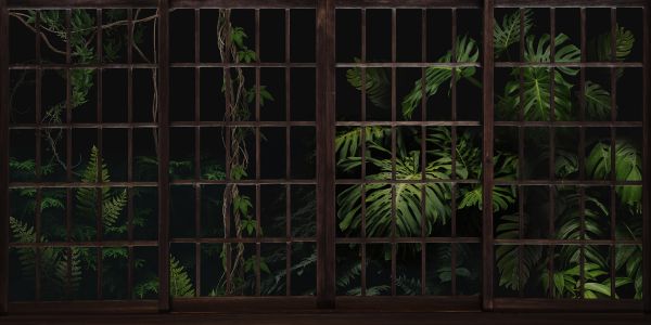Belle cornici di finestre scure con un giardino pieno di piante botaniche sullo sfondo.