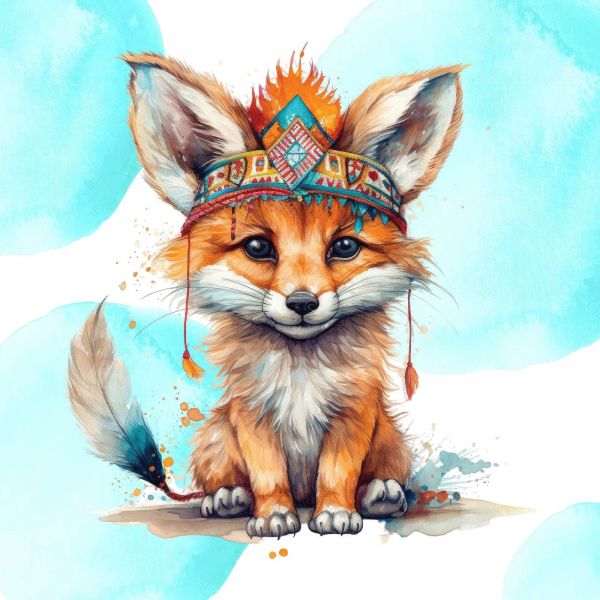 Bellissima carta da parati con un cucciolo di volpe con una corona di piume.