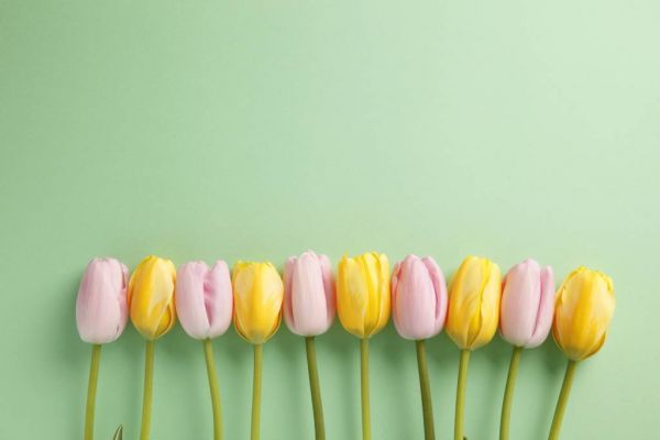 Tulipani tagliati rosa e gialli su sfondo verde menta. Una fresca e bella carta da parati fotografica, stampata su una robusta carta da parati in pile.