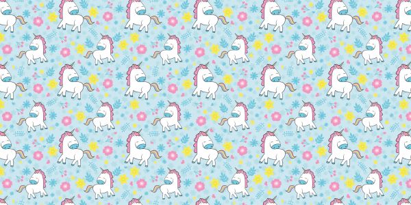 Carta da parati con piccoli unicorni e fiori. Applicatela alla parete della camera dei bambini per creare più atmosfera.