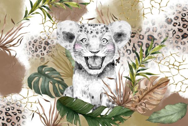 Bellissima carta da parati con un leoncino su un decoro di fogliame marrone e verde.