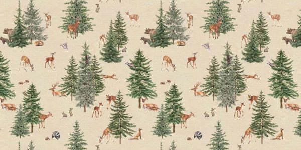 Un motivo boschivo suggestivo con cervi, volpi, orsi e altri animali del bosco, circondato da maestosi pini. Il morbido colore di sfondo e le illustrazioni dettagliate portano in vita la tranquillità di un bosco di pini, ideale per creare un'atmosfera naturale e calda in ogni ambiente.