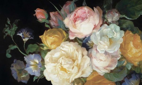 Un design caldo e accogliente con un mix di rose gialle e color crema e accenti blu. Lo sfondo scuro esalta i colori vivaci e conferisce all'insieme un aspetto drammatico e classico. Perfetto per un'atmosfera senza tempo e suggestiva.