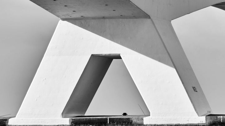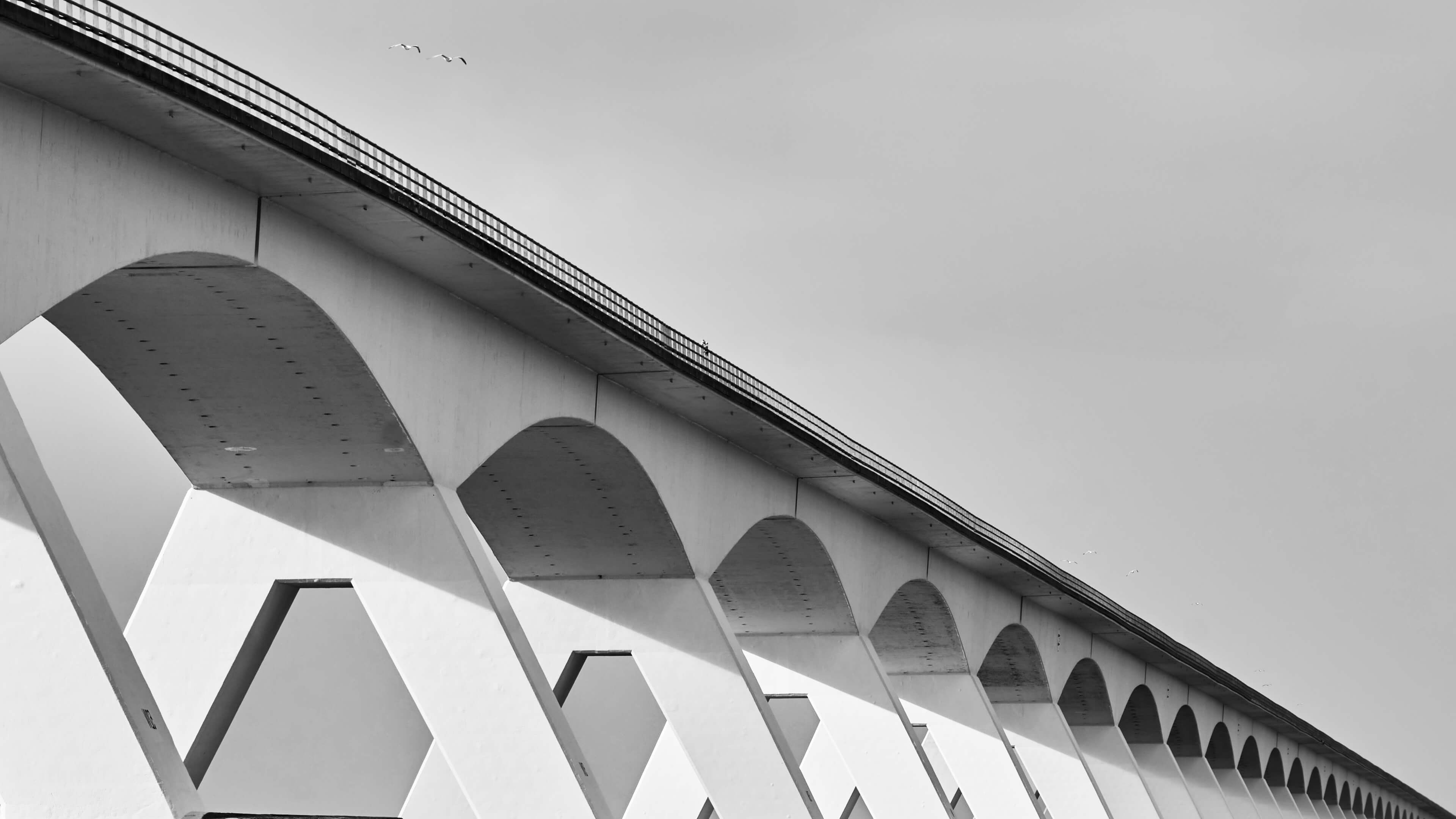 Lungo ponte splendidamente illuminato dal sole in bianco e nero