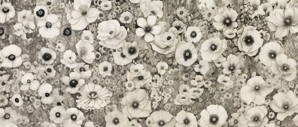 Un bellissimo campo di fiori monocromatico con papaveri dettagliati e fiori selvatici in morbidi toni di bianco e nero. I sottili contrasti e le delicate ombre conferiscono al design un aspetto classico e senza tempo. Lo stile delicato, quasi illustrativo, porta un'atmosfera serena e raffinata in ogni ambiente.