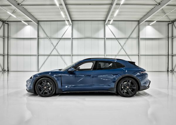 Una foto difficile della Porsche Taycan Turbo S in un capannone industriale.