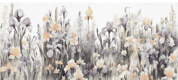 Un morbido prato fiorito pieno di iris e narcisi in toni acquerellati beige cremosi. I colori sottili e naturali creano un'atmosfera accogliente e invitante che si adatta ovunque.