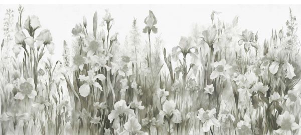 Una composizione serena di iris e narcisi in fiore, realizzata in raffinati toni di grigio che conferiscono al motivo floreale una qualità senza tempo. La tecnica dell'acquerello aggiunge una dimensione morbida, quasi fluida, rendendo il design sia moderno che classico.