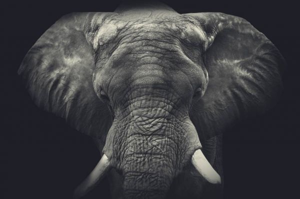Carta da parati con un'immagine ravvicinata della testa di un vecchio elefante. Sono visibili anche le zanne.