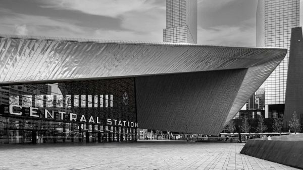 Un'impressionante immagine in bianco e nero di Rotterdam Centraal, in cui le iconiche linee nette e le superfici riflettenti della stazione catturano l'attenzione. La simmetria e il gioco di luce e ombra esaltano l'aspetto moderno e futuristico di questo punto di riferimento architettonico.