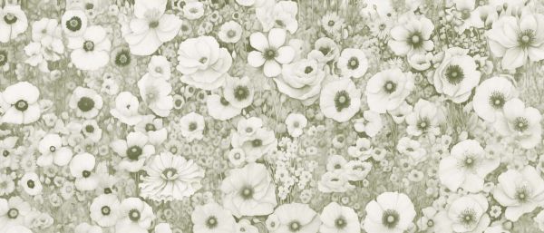 Un sereno campo di fiori monocromatico con sottili tonalità di verde che conferiscono ai papaveri e ai fiori selvatici un'elegante allure naturale. Il gioco di luce e ombra dona un aspetto tranquillo, ma comunque vivace.