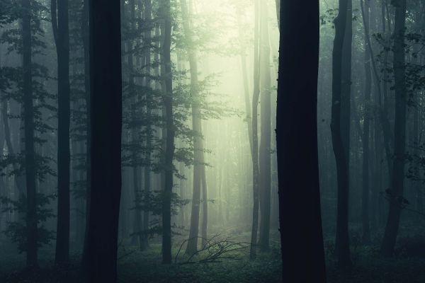 Un raggio di sole in una foresta scura, un paesaggio forestale misterioso.