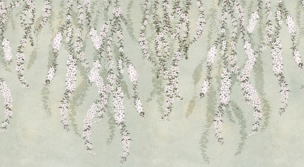 Hermosas ramas llenas de flores blancas sobre un fondo de hormigón verde claro.