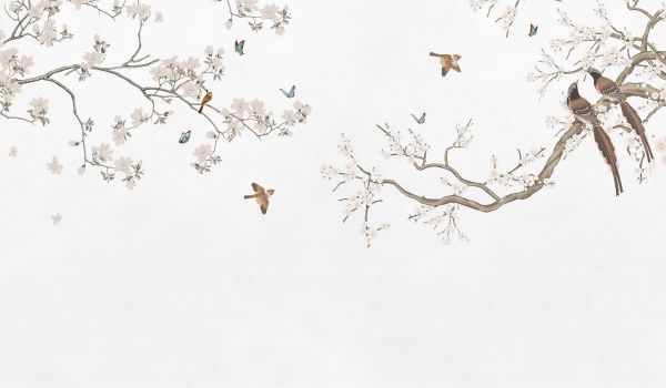 Una rappresentazione serena della primavera, con rami di ciliegio che si sventolano dolcemente e tra i quali si muovono farfalle e uccelli che cantano dolcemente. Le tonalità pastello dei fiori contro il cielo limpido creano un senso di rinnovamento e di pace.