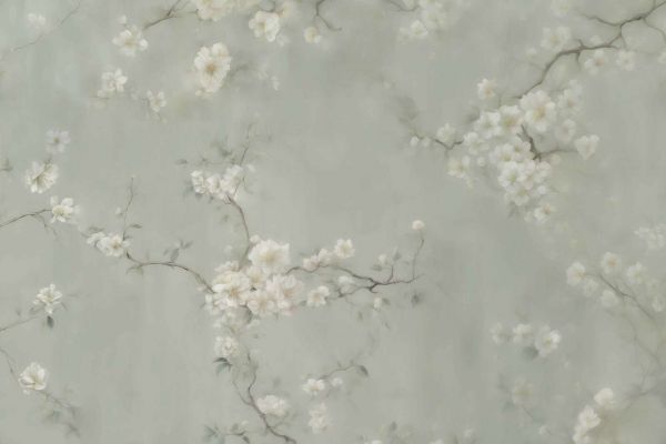 Fiori bianchi delicati sbocciano su rami eleganti contro uno sfondo grigio-verde morbido. Le sottili pennellate e gli effetti acquerello conferiscono un aspetto sognante e raffinato, mentre la composizione elegante aggiunge un'eleganza senza tempo allo spazio.