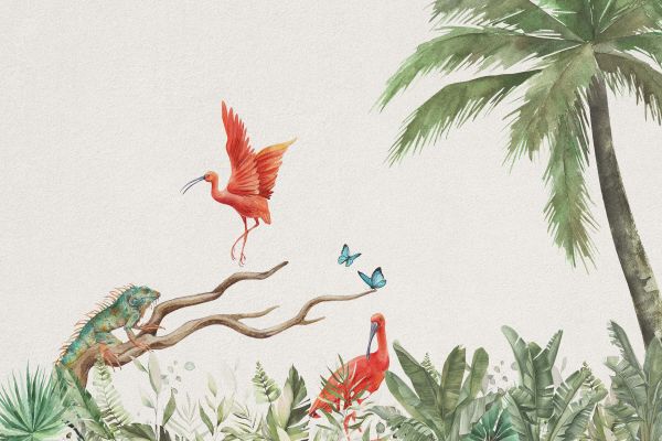 Una foto colorata con un grande ramo. Su questo ramo un'iguana sta guardando due farfalle blu. Si vedono anche due ibis rossi.