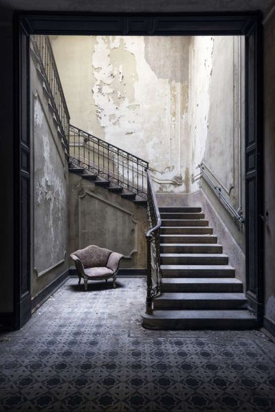 La pittoresca scala di una gigantesca villa ai margini delle Alpi italiane. La poltrona invita a soffermarsi ed emana una certa calma.