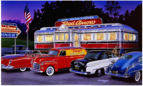 Questa immagine ti porta a una serata nostalgica al classico "Red Arrow Diner", dove il fascino retrò e lo stile vintage si incontrano.