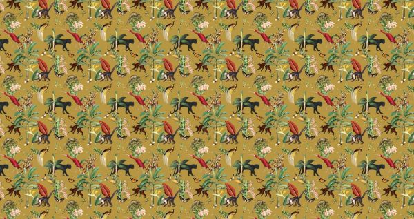 Questo design ti immerge nel dinamico mondo di una foresta pluviale tropicale. Lo sfondo giallo ocra ricco aggiunge una base calda e accogliente, mentre dettagli colorati di animali come scimmie, uccelli e farfalle si uniscono a lussureggianti piante e fiori tropicali. Ogni elemento emana energia e vivacità, creando un insieme visivamente impressionante.