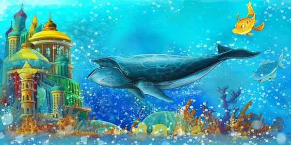 Una balena, un pesce e una barriera corallina nel bellissimo regno sottomarino.