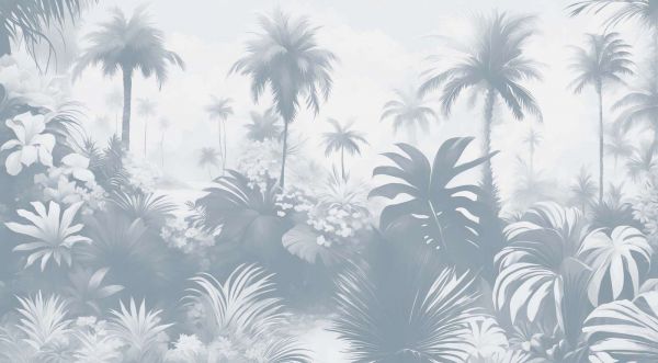 Un raffinato paesaggio tropicale in tenui tonalità blu-grigie, con eleganti palme e lussureggianti piante esotiche. La sottile nebbia e le fresche tonalità pastello creano un'atmosfera serena e rilassante, perfetta per un'ambiente calmo e stiloso in ogni interno.