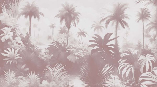 Un sogno tropicale in tenui tonalità rosa pallido, con eleganti palme e lussureggianti piante esotiche. Lo sfondo nebbioso e le sottili sfumature di colore creano un'atmosfera serena, quasi romantica. Perfetto per un aspetto rilassante e raffinato in ogni interno.