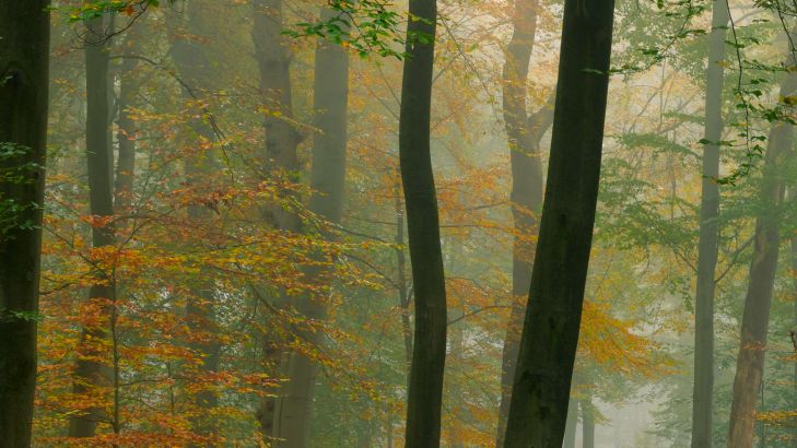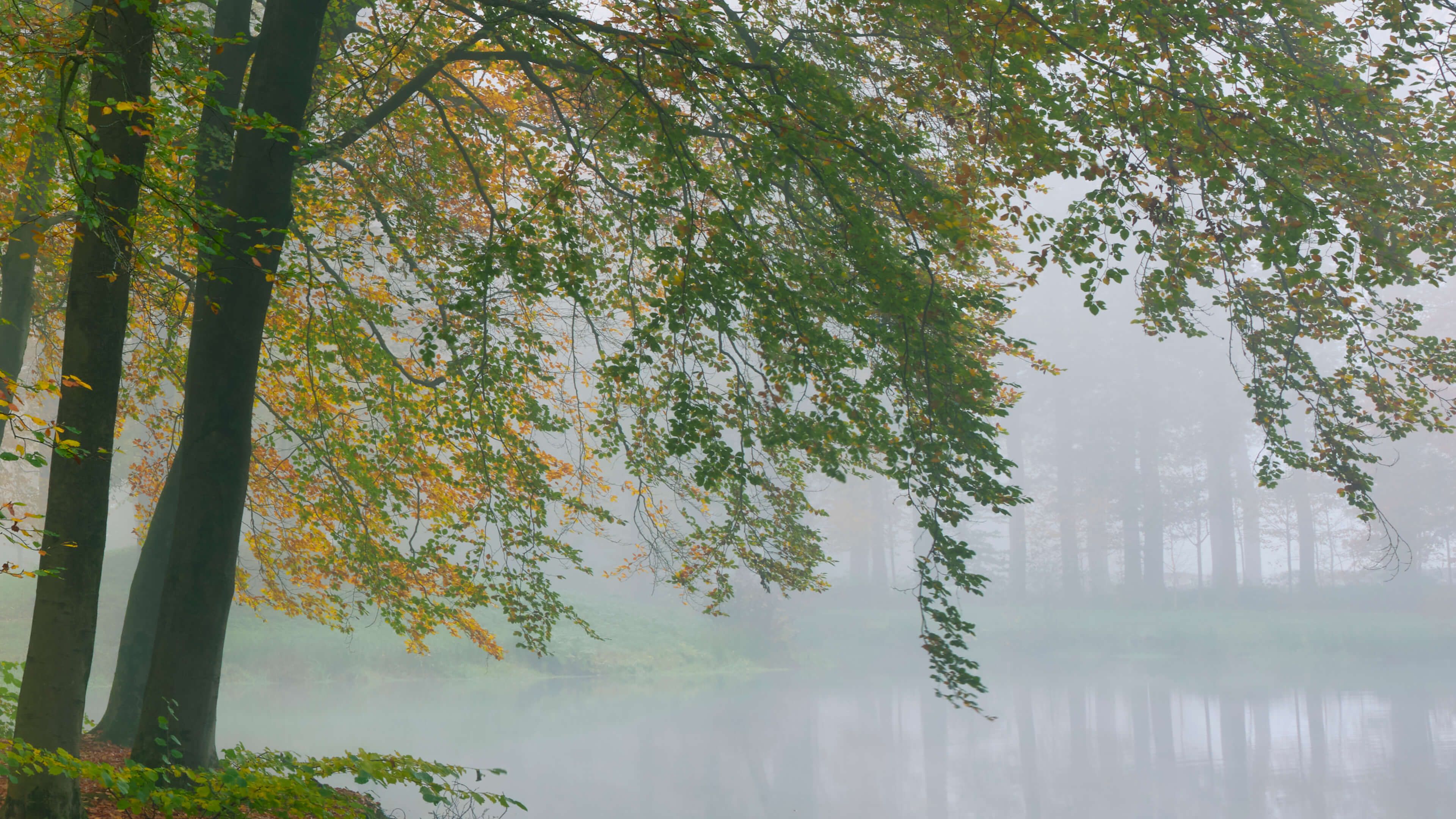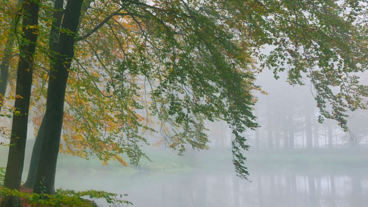 Bellissimo riflesso di alberi in uno stagno. Una nebbia incombe sull'acqua, che sembra misteriosa.
