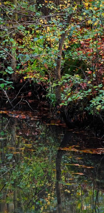 Un bellissimo riflesso di alberi piegati nell'acqua. I colori dell'inizio dell'autunno danno a questa foto un effetto potente.