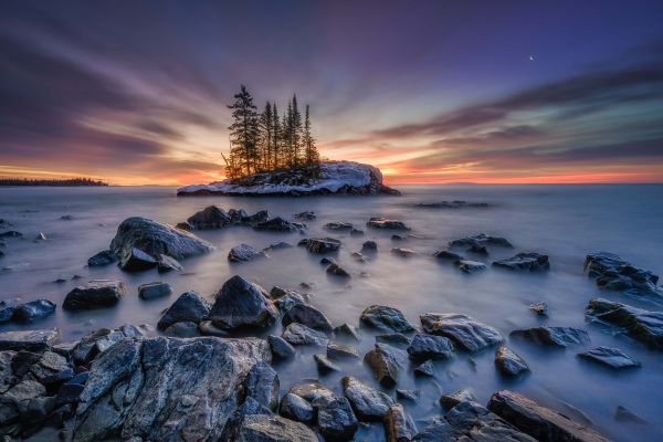 Risorto su sfondo fotografico. Bellissima alba dietro un'isola con pini.