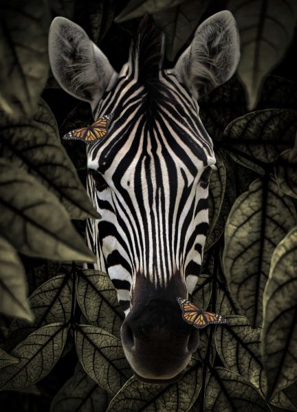Ritratto di zebra della giungla su carta da parati. Una zebra circondata dalle foglie della giungla - formato ritratto.