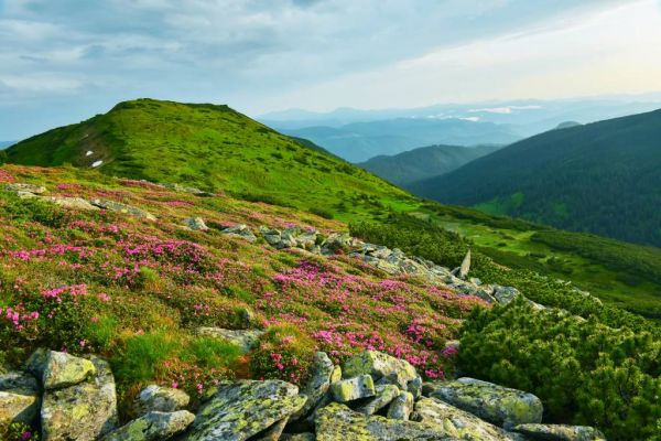 Rododendri in montagna su carta da parati fotografica. Una bella vista panoramica con prospettiva atmosferica