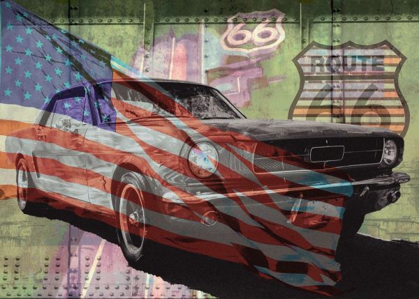 Un'opera d'arte ispirata al vintage che combina un'auto classica con simboli americani iconici come i cartelli della Route 66 e la bandiera degli Stati Uniti. Il design emana nostalgia e libertà.