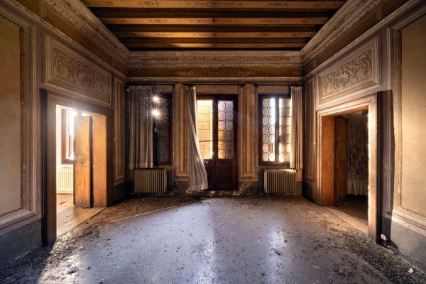 Questo design cattura l'atmosfera di un palazzo abbandonato in rovina, dove il tempo ha lasciato il suo segno. Il bagliore dorato dei raggi del sole filtra attraverso le vecchie finestre e illumina i dettagli eleganti, ma logori, dello spazio. La vernice scrostata, i pavimenti consumati e gli ornamenti con una ricca storia conferiscono a quest'immagine una bellezza malinconica, come se lo spazio stesse aspettando un nuovo capitolo.