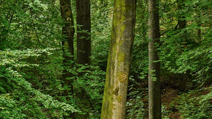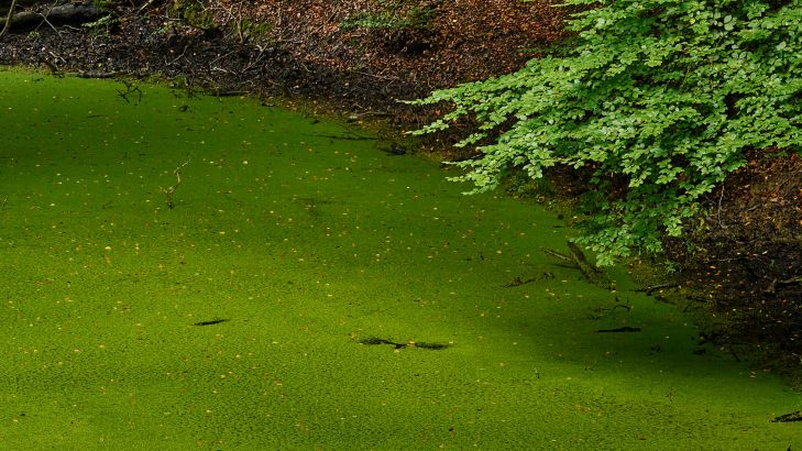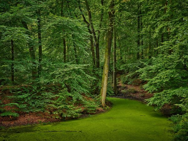 Ruscello coperto di alghe nella foresta. Con questa carta da parati fotografica nella tua stanza, è come se potessi camminare nella foresta.