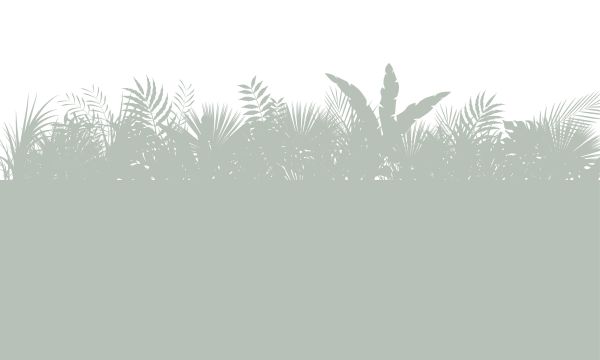 Sfondo verde chiaro che va a metà della stampa e si trasforma in sagome di diverse foglie tropicali.