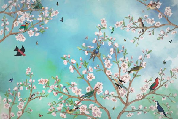 Questo design cattura l'essenza di una mattina di primavera con fiori di ciliegio in fiore, uccelli affascinanti e farfalle eleganti che insieme formano una scena vivace. Il cielo blu tenue con nuvole sottili sottolinea l'atmosfera fresca e naturale, emanando calma e vitalità.