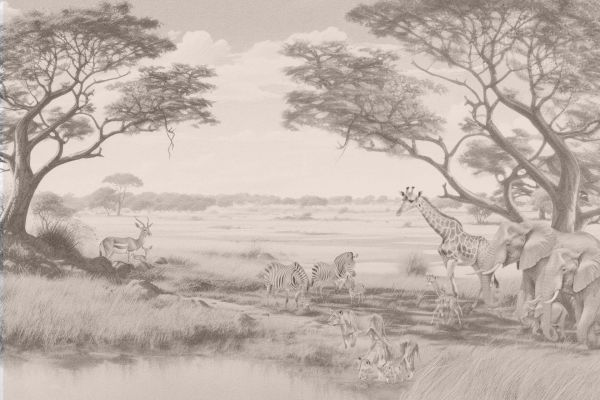 Un'impressione pittoresca della savana africana, dove la tavolozza di colori tenui di toni marroni e beige trasuda la calma della natura. La convergenza armoniosa di elefanti, giraffe e zebre riflette la coesistenza pacifica, mentre il vasto orizzonte sottolinea la vastità del paesaggio.