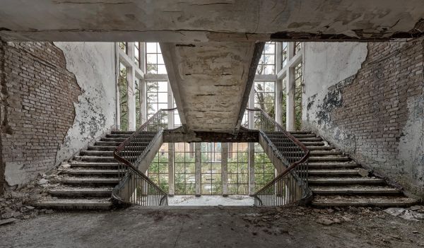 Scala di una scuola abbandonata. Con questa carta da parati fotografica in casa, è come entrare in una scuola abbandonata.