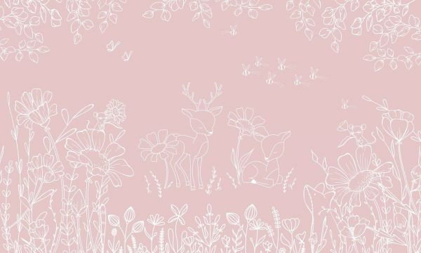 Un'illustrazione lineare raffinata di cerbiatti tra fiori di campo eleganti e piccoli insetti volanti. Lo sfondo caldo rosa antico e contorni bianchi morbidi creano un aspetto tranquillo, dolce e sognante.