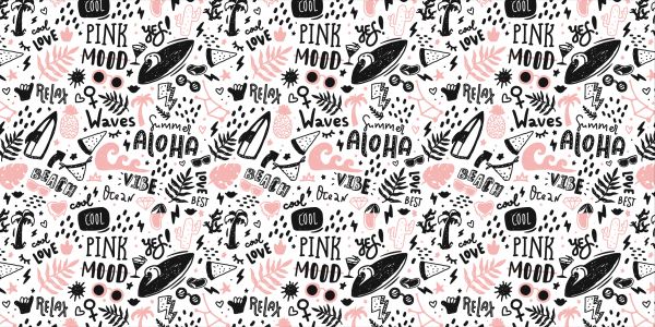 Pattern con icone doodle e lettering. Include tavole da surf, palme e cocomeri.