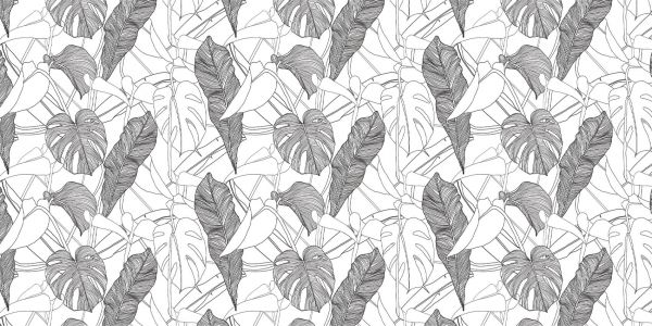 Carta da parati bianca con un motivo pieno di piante esotiche in linee sottili.
