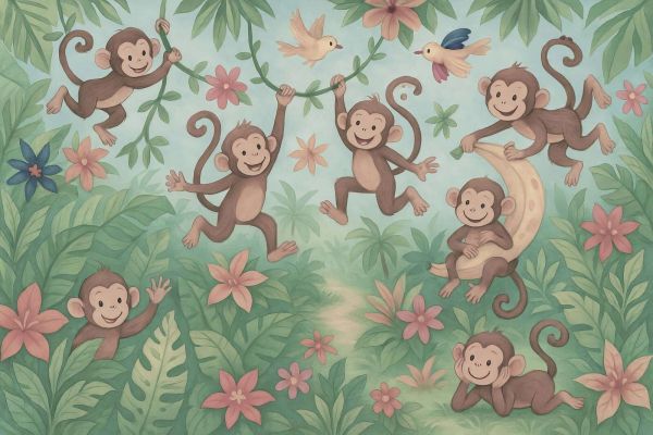L'uso dei colori è allegro e giocoso: diverse tonalità di verde dominano il baldacchino delle foglie, mentre fiori in rosa tenue, corallo, arancione e blu scuro aggiungono tocchi vivaci. Le scimmiette sono disegnate in tonalità di marrone caldo e hanno volti espressivi e sorridenti che conferiscono al tutto un fascino birichino. Gli uccellini in giallo pastello e blu aggiungono movimento e colore.
