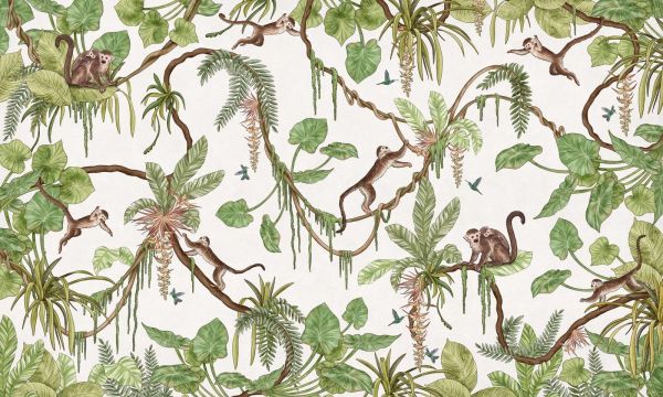 Scimmie vivaci giocano tra il verde tropicale, fiori e liane su uno sfondo bianco fresco. Il design trasmette allegria, naturalezza e luminosità con tonalità di verde morbido e accenti marroni caldi.