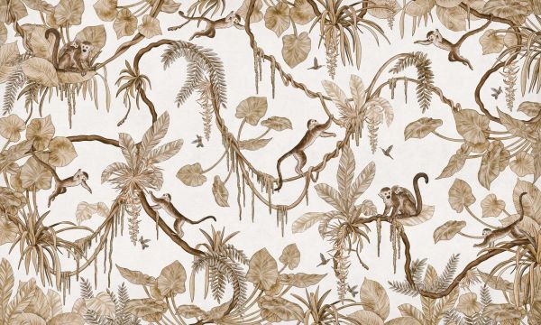 Tra foglie tropicali e liane pendenti giocano scimmie in un caldo scenario giungla. Lo sfondo chiaro e le tonalità marroni naturali conferiscono al design un'aria fresca e amichevole con un fascino classico.