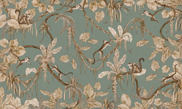 In questo sottile design giungla, giocosità e raffinatezza si incontrano in perfetta armonia. Tra foglie esotiche, fiori di heliconia e liane intrecciate, piccole scimmie vivono la loro allegra vita: saltano, arrampicano o si riposano sui rami. I toni caldi di sabbia e seppia del fogliame e degli animali contrastano splendidamente con lo sfondo verde-blu ingrigito, che conferisce all'insieme una base morbida e elegante. Lo stile illustrativo è dettagliato e naturale, con linee classiche che ricordano antiche stampe botaniche. Grazie ai colori sobri, l'insieme appare tranquillo ed elegante, mentre la dinamicità delle scimmie mantiene l'immagine vivace. Perfettamente adatto a un interno botanico o naturalistico di ispirazione scandinava, dove la tranquillità, la giocosità e l'estetica possono rafforzarsi reciprocamente. Abbinatelo a mobili in legno chiaro o scuro, tessuti in lino o velluto in tonalità neutre morbide, e accenti in ottone, rattan o ceramica. Ideale per camere per bambini, angoli giochi o nursery, ma anche elegante in una zona lettura, ingresso, studio medico o boutique hotel. I colori tenui e le figure giocose rendono il design accessibile a giovani e anziani, senza essere troppo infantile. Una scena giungla equilibrata e suggestiva - perfetta per chi cerca un'esperienza naturalistica con un tocco caldo e raffinato.