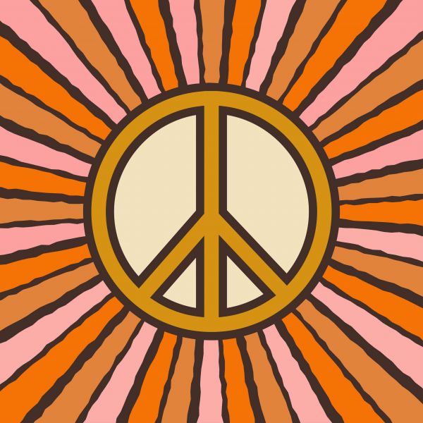 Carta da parati con un segno di pace in colori hippie. Create un'atmosfera anni '60 in camera da letto.