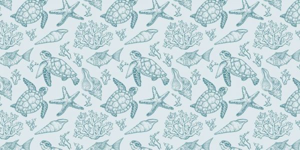 Tartarughe marine galleggiano tranquillamente tra alghe e coralli in questo affascinante pattern blu. Il ritmo calmo della ripetizione evoca una sensazione di pace, un'ode alla serenità e alla purezza intatta del fondale marino.