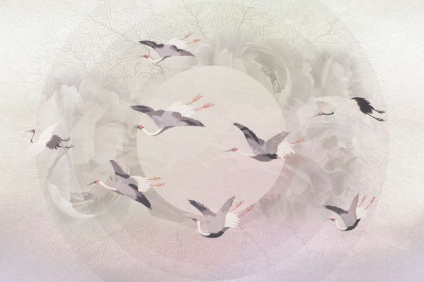 Este encantador diseño representa grullas en pleno vuelo, un símbolo de gracia y armonía. Los pájaros se mueven a través de un fondo etéreo de tonos rosa pastel, azul y verde, sutilmente realzados por suaves acentos florales. Las capas circulares añaden profundidad, creando una sensación de espacio infinito. La combinación de elementos naturales y colores aireados aporta una sensación de paz y equilibrio a cualquier habitación.